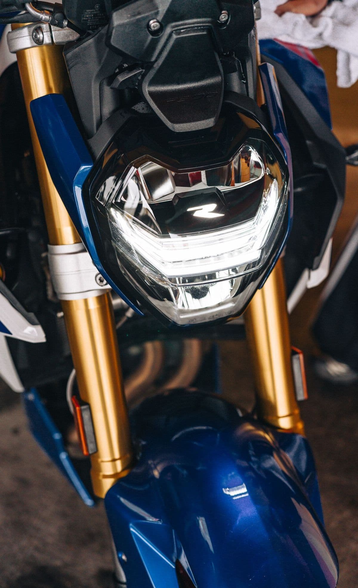 Forlygten på F 900 R fanger straks blikket med sit sporty design. Beklædningen matcher den valgte lakering og skaber et harmonisk helhedsudtryk.